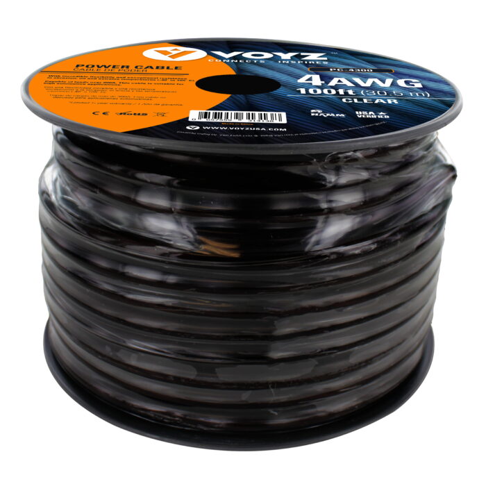 Product Categories: Power Cables Product Page: https://www.voyzusa.com/product/pc-4300/   Product SummaryUpgrade Your Car Audio Power with 4AWG Power Cable.Enhance your car audio system's performance with our 4AWG Power Cable. This 100-foot cable is engineered for maximum power delivery, ensuring your car audio equipment receives the energy it needs for optimal sound quality. The clear black Flex Oxygen Free PVC jacket offers durability and flexibility for easy installation. Whether you're connecting power amplifiers to car batteries or upgrading your car audio setup, this cable is a reliable choice.     Product DescriptionClear Black Power CableLength: 100FT
