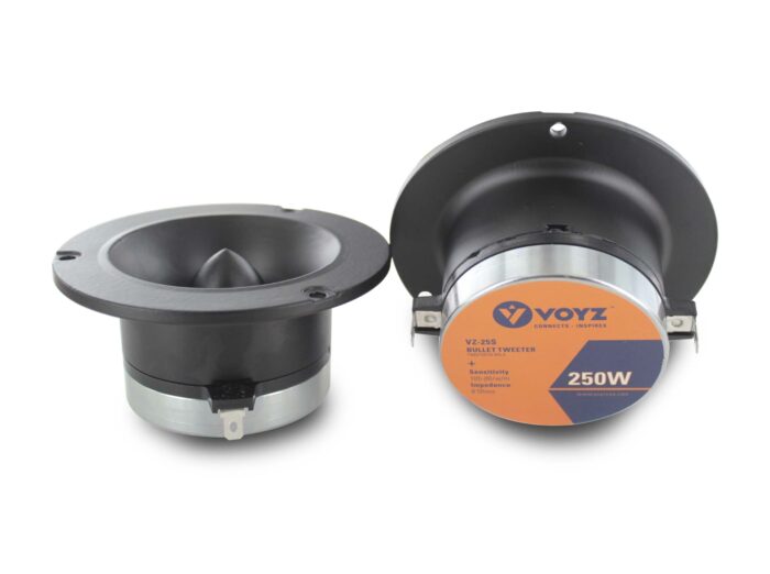 Elevate your sound quality with our Pro Tweeters. These bullet tweeters boast a powerful 250W power rating, offering crystal-clear highs. With a wide frequency range from 2KHz to 20KHz and a high sensitivity of 105dB/1W/1M, they ensure precise and detailed audio. Crafted with a titanium diaphragm and aluminum housing, they are built to last. Upgrade your audio setup with Pro Tweeters for an immersive experience.