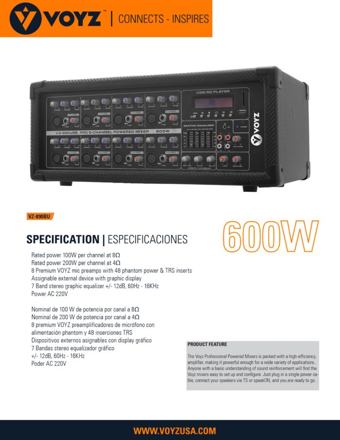 PROFESSIONAL POWERED MIXER 8 CHANNELS 600W VZ-890BU